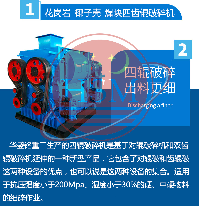 四輥破碎機也叫四齒輥破碎機,是一種冶金礦山設備配套中、細碎產品,適用進料粒度<90mm、成品粒度要求100目至5毫米的超細碎作業。四個輥面分為堆焊輥面或者平輥面,按照用戶要求粒度選擇組合,該設備具有結構緊湊,占地小,破碎比大、產量較高。